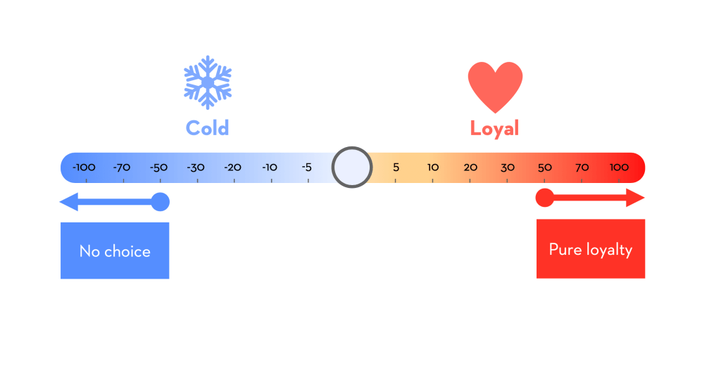 NLS je jednoduchý průzkum se třemi otázkami. Výsledné score funguje jako “teploměr” – spolehlivě ukazuje, nakolik jsou zákazníci loajální. Z výsledků mnoha měření NLS v různých firmách a propojení odpovědí respondentů s jejich reálnými transakčními daty máme vyzkoumáno, že skutečná loajalita začíná na 50 bodech. Maximální loajalitu jsme zatím naměřili na úrovni 70 bodů. Score v modrém pásmu indikuje chladný vztah zákazníků k firmě a aktuálně nejnižší naměřená hodnota je -54 bodů.